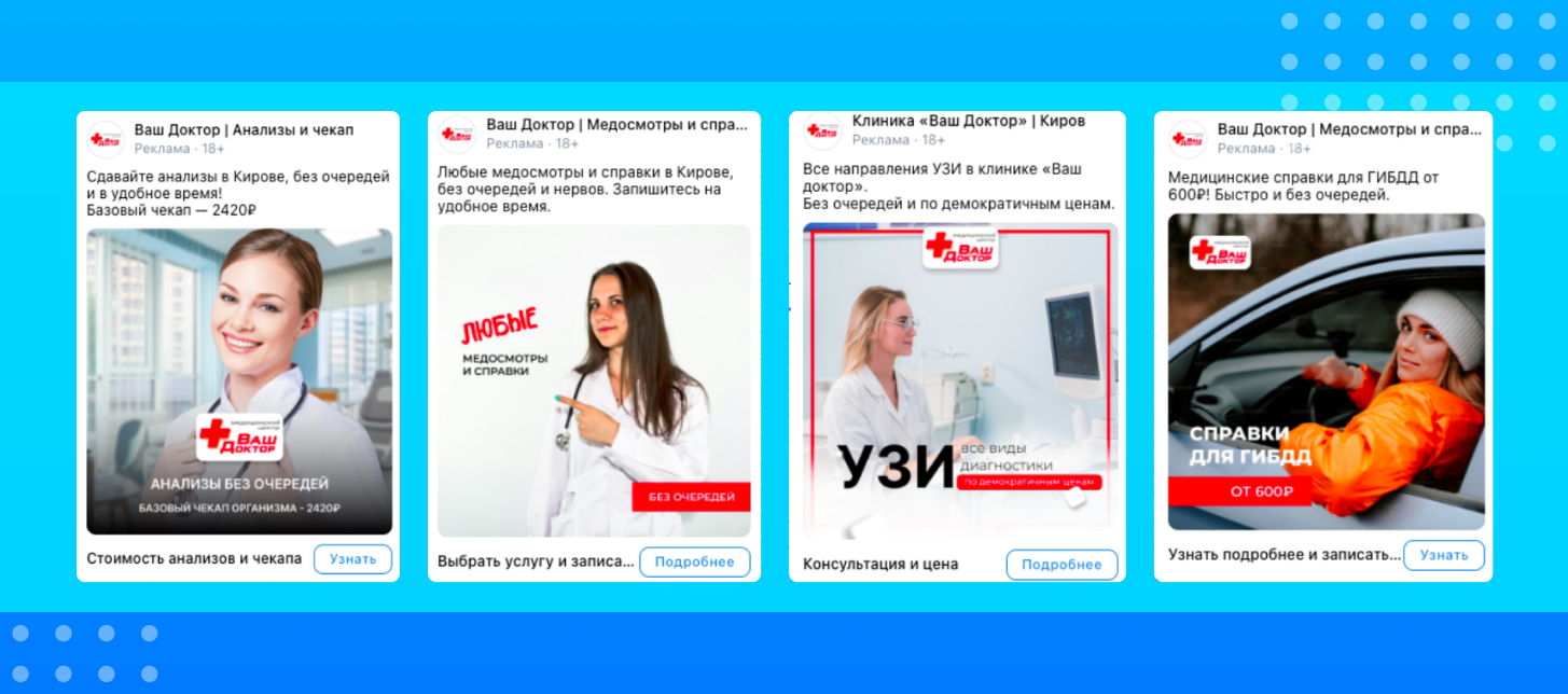 - Проведена креативная работа: акценты на мед-персонал, быструю запись, минимальные цены.