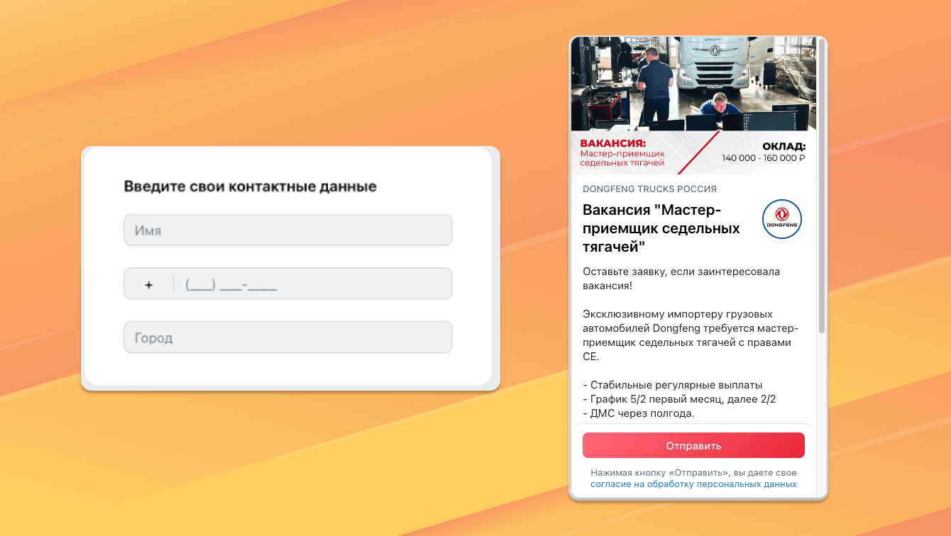 Создали лид-форму в которой описали более подробно условия для кандидатов на вакансию. Сама форма содержала при этом минимум информации для заполнения.