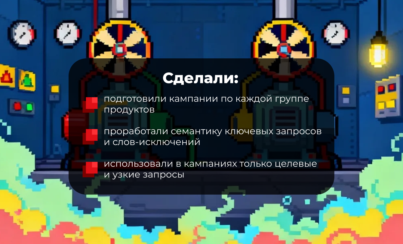 - использовали в кампаниях только целевые и узкие запросы, чтобы исключить «размывание» аудитории, так как специфика продукта предполагает пересечение запросов с бытовым форматом, а наша цель была B2B сегмент.